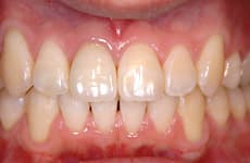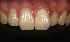 プラスチックの歯によって修復されています。色、形態とも不自然で、不適合のため、歯周病の原因にもなっています。