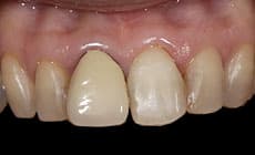 従来のセラミックのブリッジが破折しています。右上の前歯が少し長く、形態がアンバランスです。